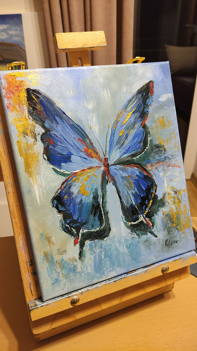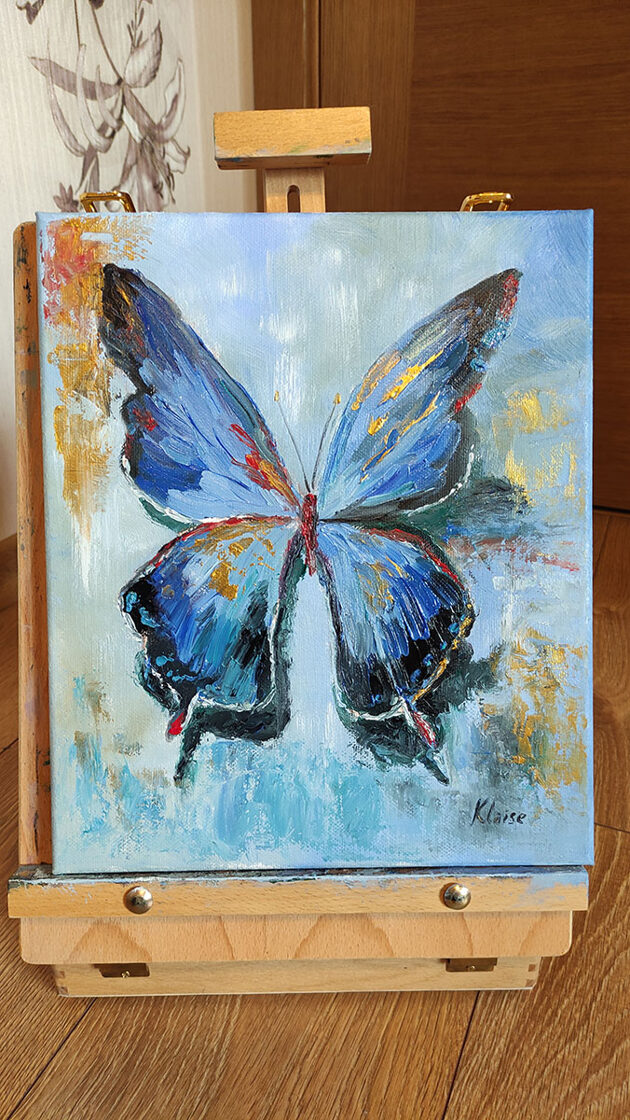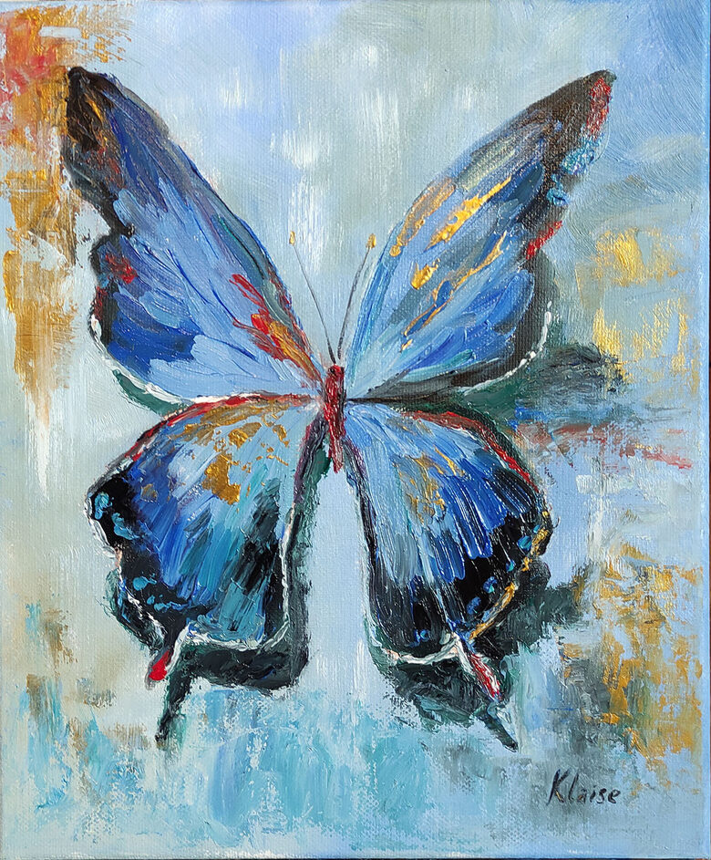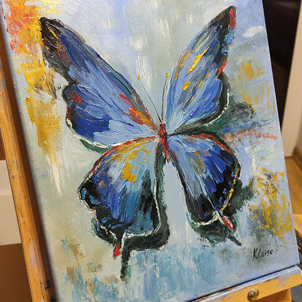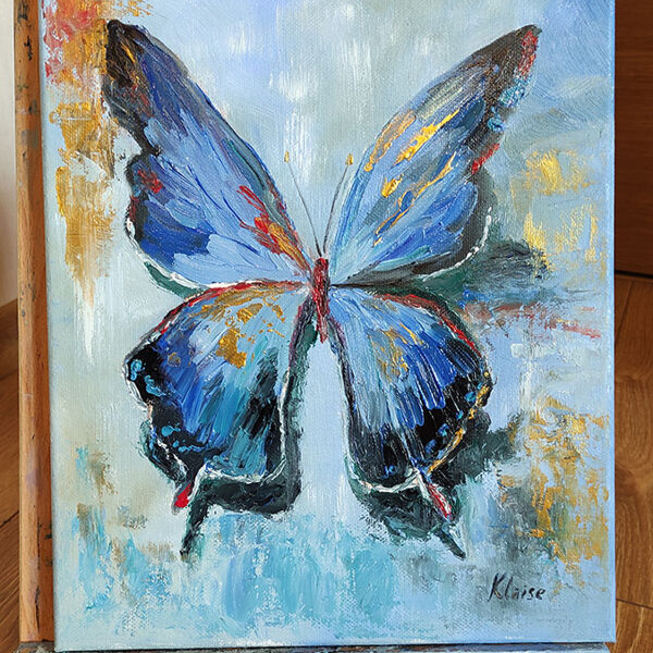 A delicate butterfly, rendered in oil and gold acrylic, graces a 30x25 cm canvas. Its crimson body and gilded wings are set against a calming blue backdrop. The artwork evokes a sense of weightlessness and transience, as if the butterfly has landed for but a fleeting moment before continuing its ethereal journey.
