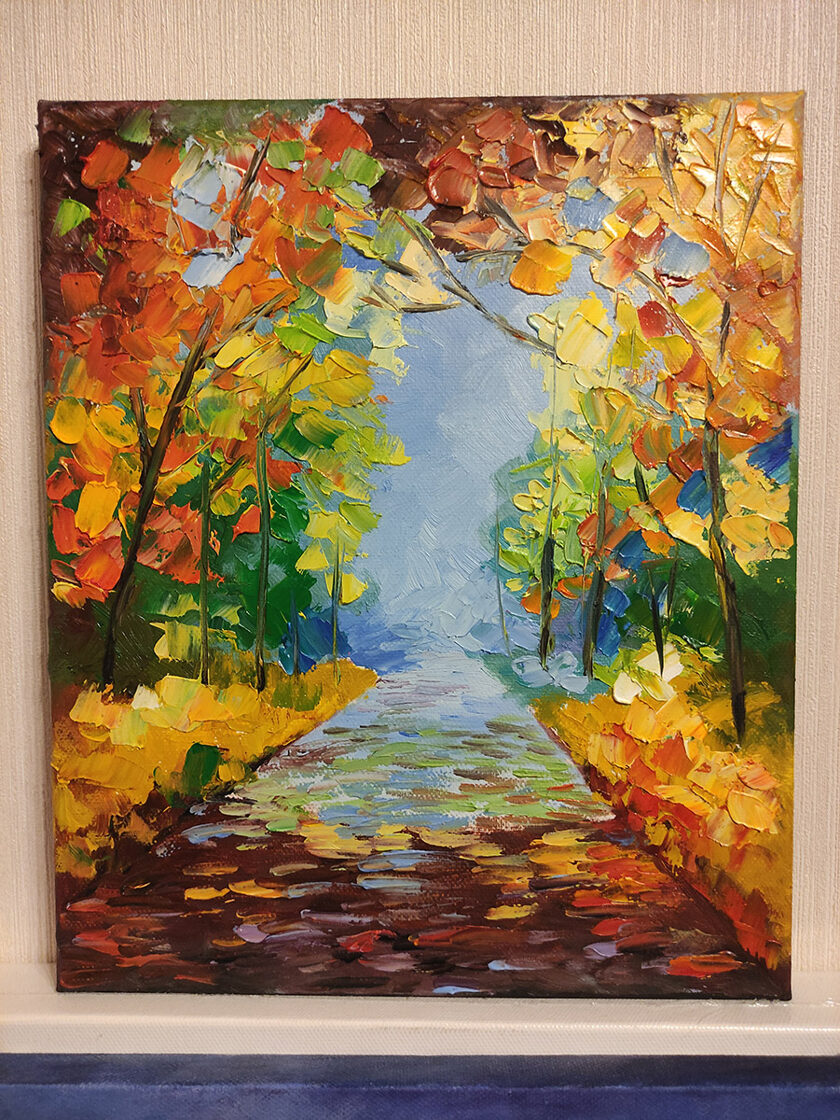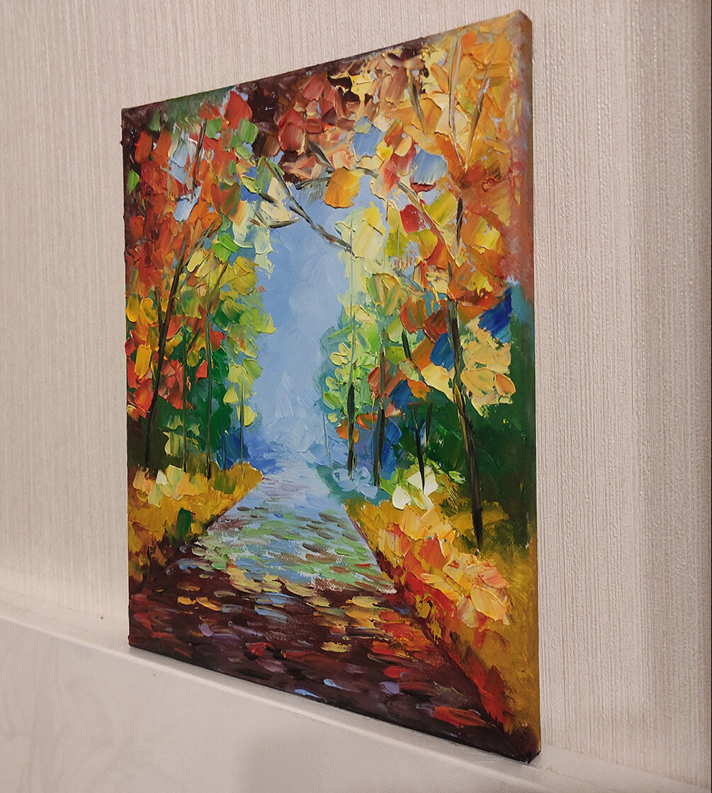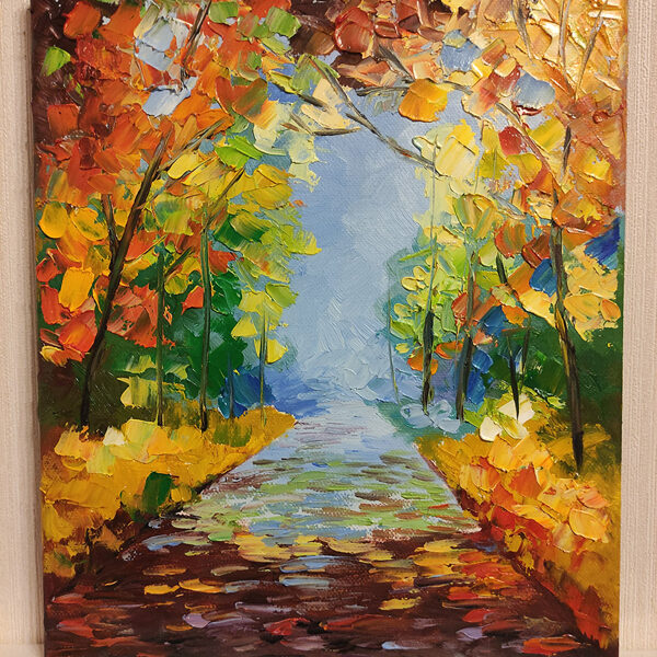 The artist has employed the impasto technique to create a rich, textured surface, with thick brushstrokes capturing the movement of the wind through the trees. Vibrant hues of yellow, orange, and red dominate the palette, evoking the warmth and brilliance of the autumn season. A narrow, winding path leads the viewer's eye into the heart of the painting, inviting contemplation and introspection. This intimate depiction of an autumn alley is a celebration of the season's beauty and the enduring appeal of distinctive style.
