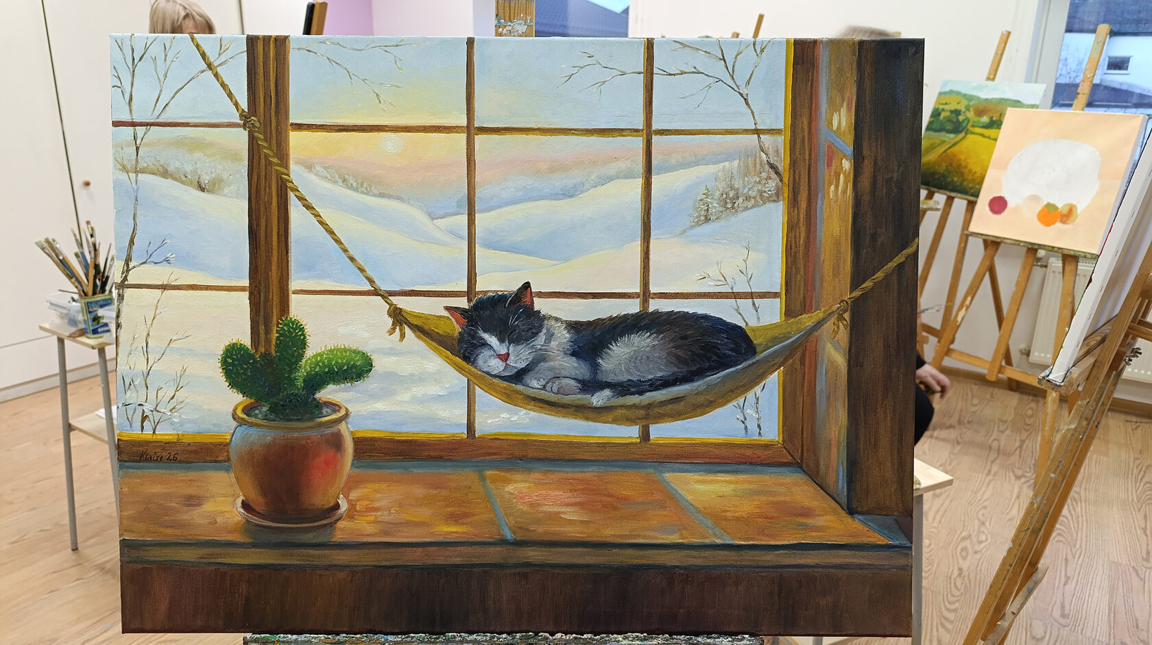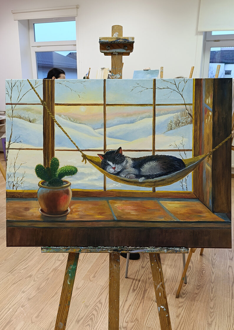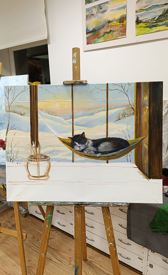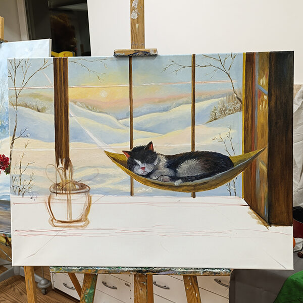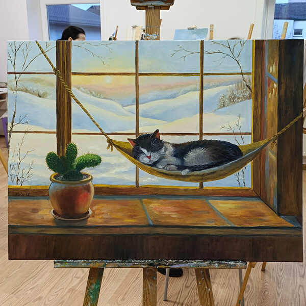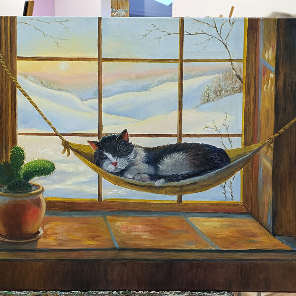This piece captures a moment of ultimate peace: a fluffy cat drifting into a deep sleep in a cozy indoor hammock, while a golden winter sunset glows over the snowy hills outside. The warm light on the windowsill contrasts beautifully with the frost-covered trees, creating a "fairytale" atmosphere that warms any room.