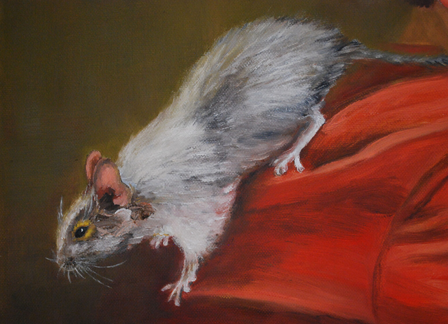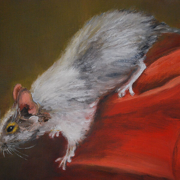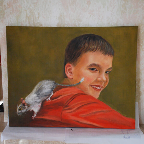 In the foreground Arthur in a red sweater turns smiling towards the viewer. His pet degus Bella crawls nearby, playfully tickling her owner's cheek with her fluffy tail. The ochre background emphasizes the lightness and candor of the scene. The mutual joy and affection of the boy and pet are palpable and touch the viewer. A bright, upbeat image of childhood and human-animal friendship. A talented work infused with the artist's love.