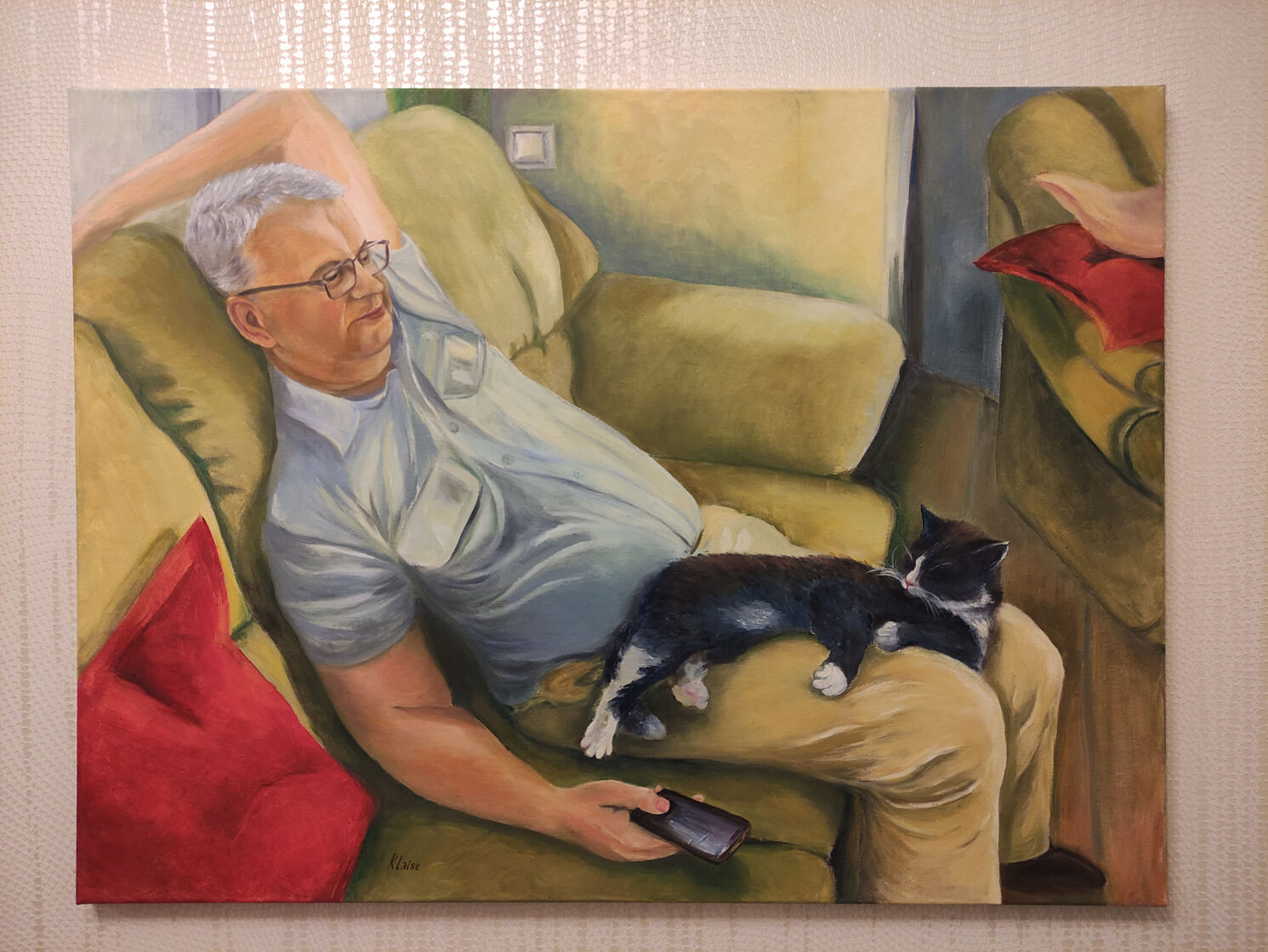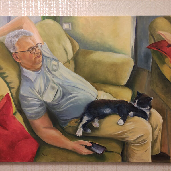 BACKoil painting man relaxing on sofa, cat sleeping on lap, calm atmosphere, intimate moment, tranquil scene, painting idyll, contemporary art, man and cat, afternoon nap, figurative art, peaceful moment, red pillow, cat sleeping
