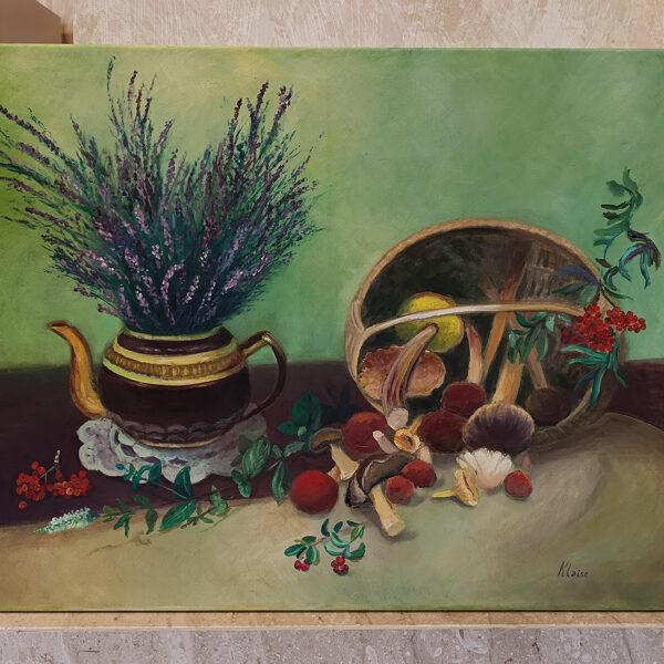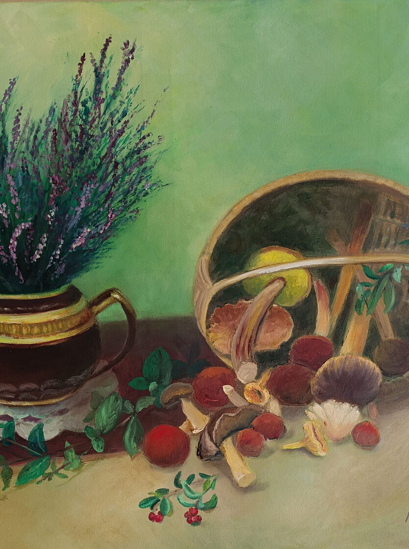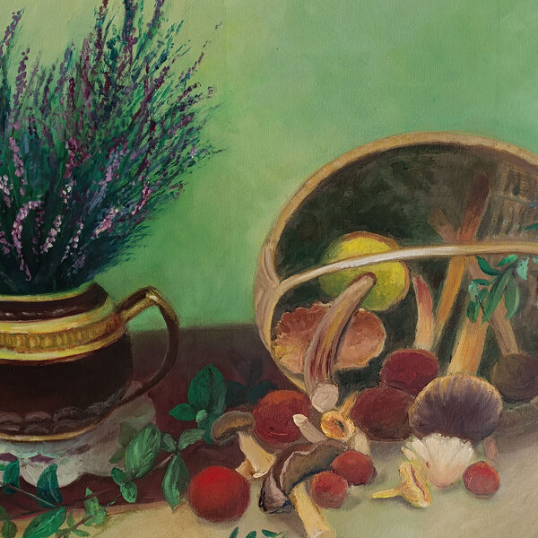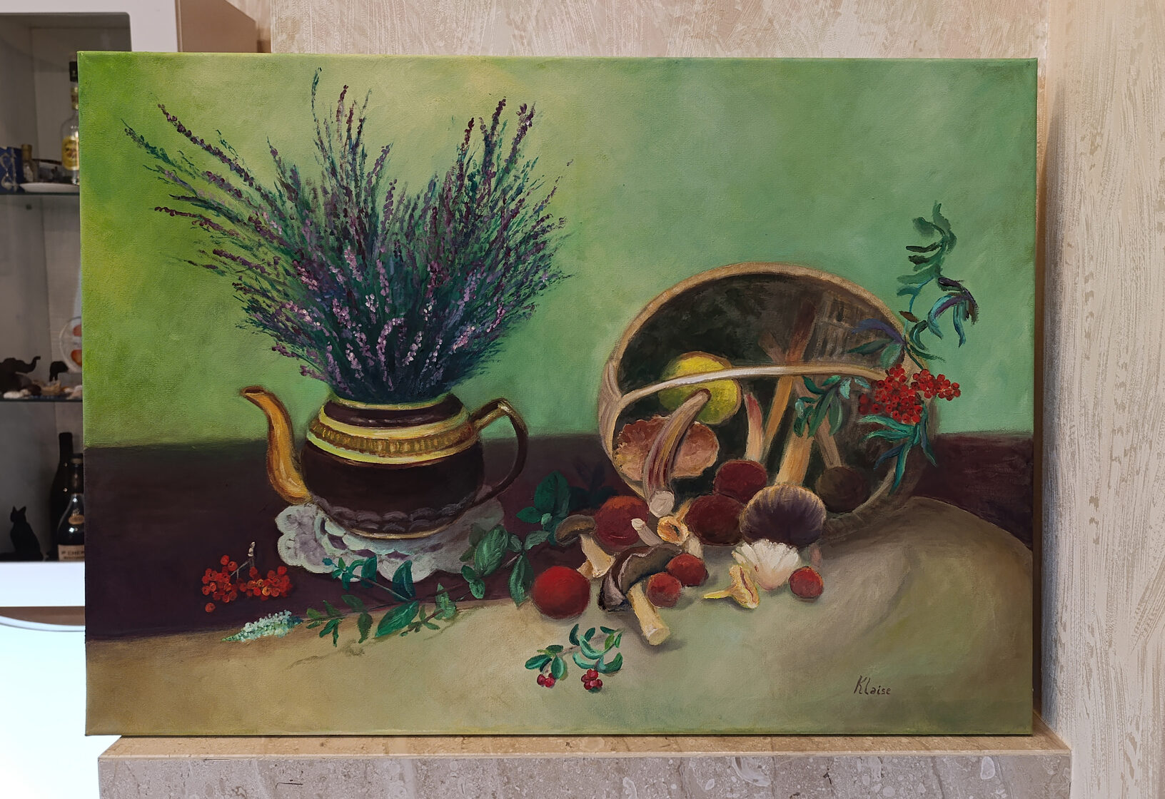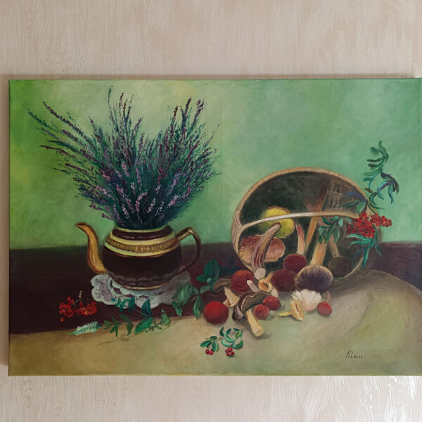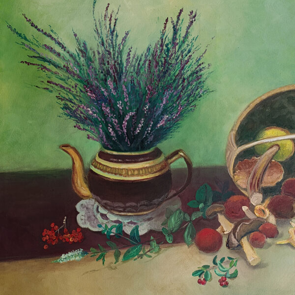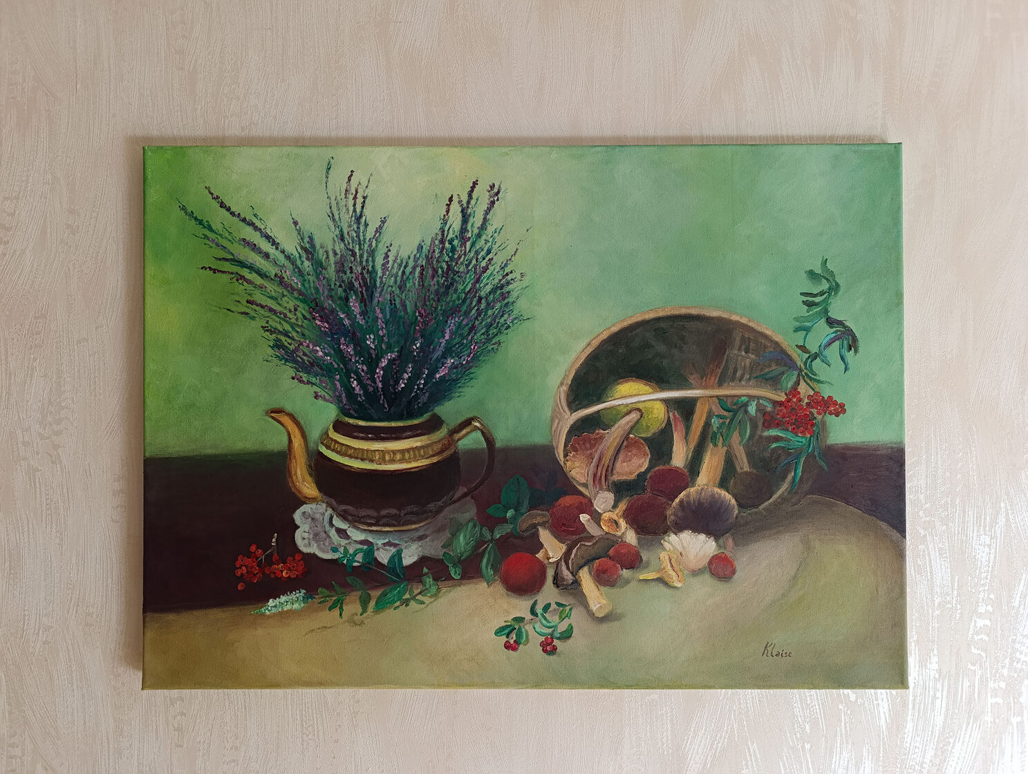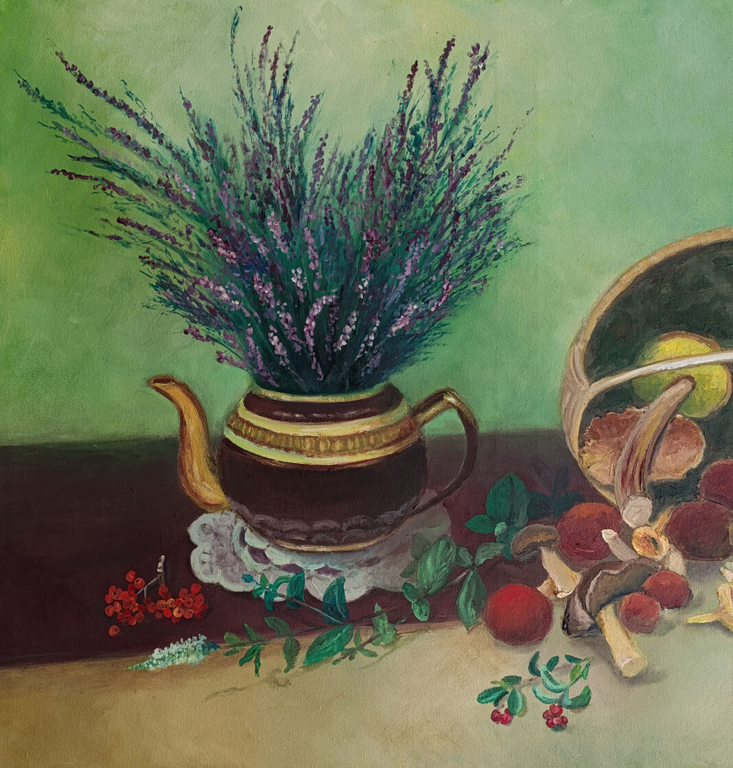 Still life, mushrooms, heather, rowan, berries, teapot, autumn, forest, gifts, harvest, autumn still life, oil painting