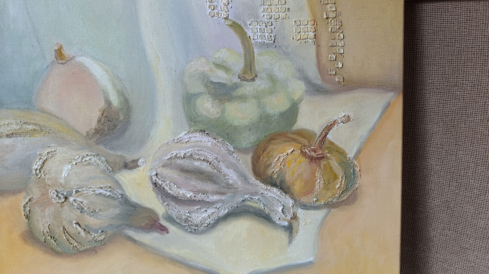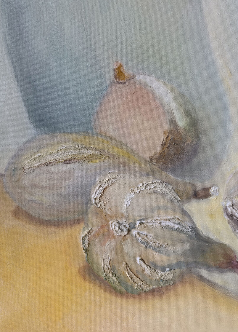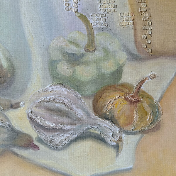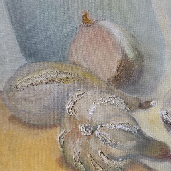 Bring a touch of serene, rustic elegance to your home with this original oil painting. This 70x50 cm still life captures a collection of heirloom squashes and pattypans, rendered in a sophisticated palette of muted sage, cream, and warm ochre.