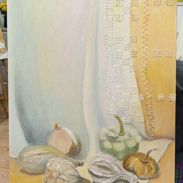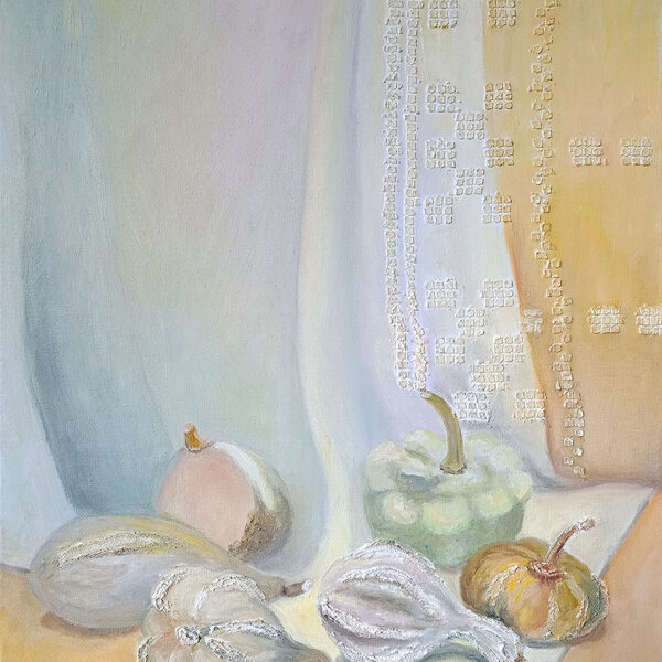 The artist beautifully balances the organic, textured forms of the vegetables against a delicate, lacy backdrop, creating a play of light and shadow that feels both timeless and modern. The soft, hazy atmosphere evokes a sense of calm and quiet contemplation.