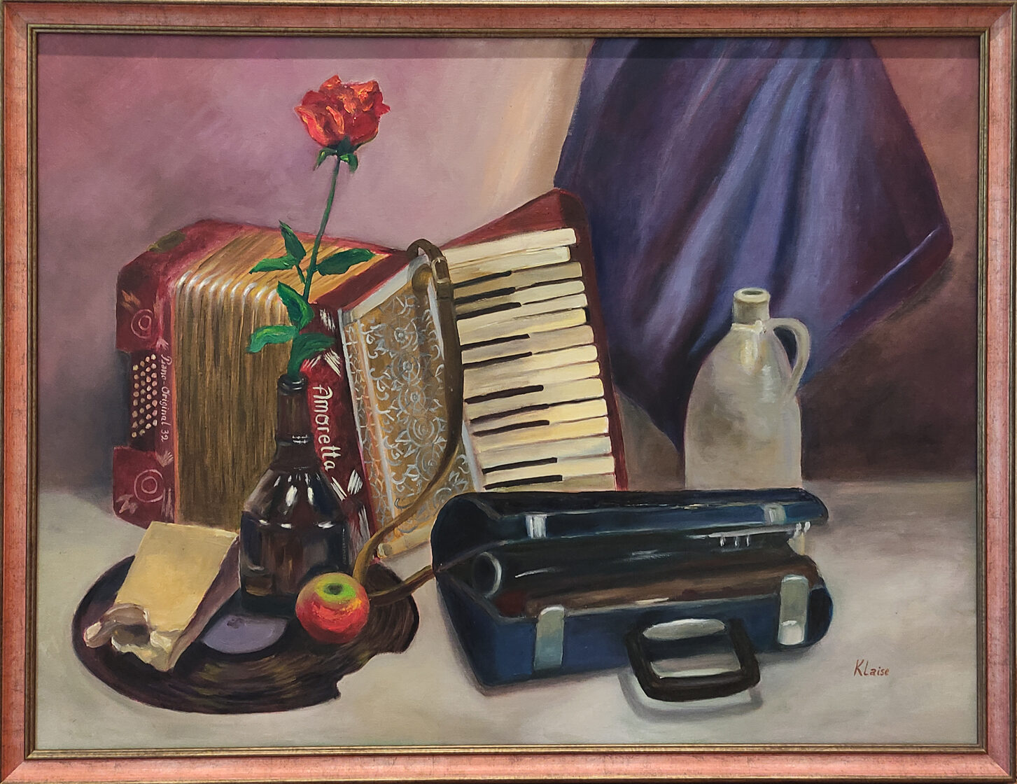 still life, accordion, musical instruments, nostalgia, oil painting, record player, wind instrument, vintage, musical heritage, color composition, symbolism in art, musical memorabilia, artistic reflection, rose, apple