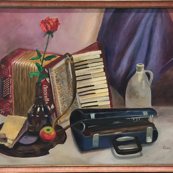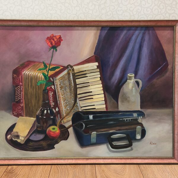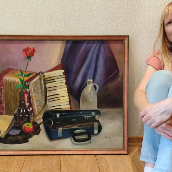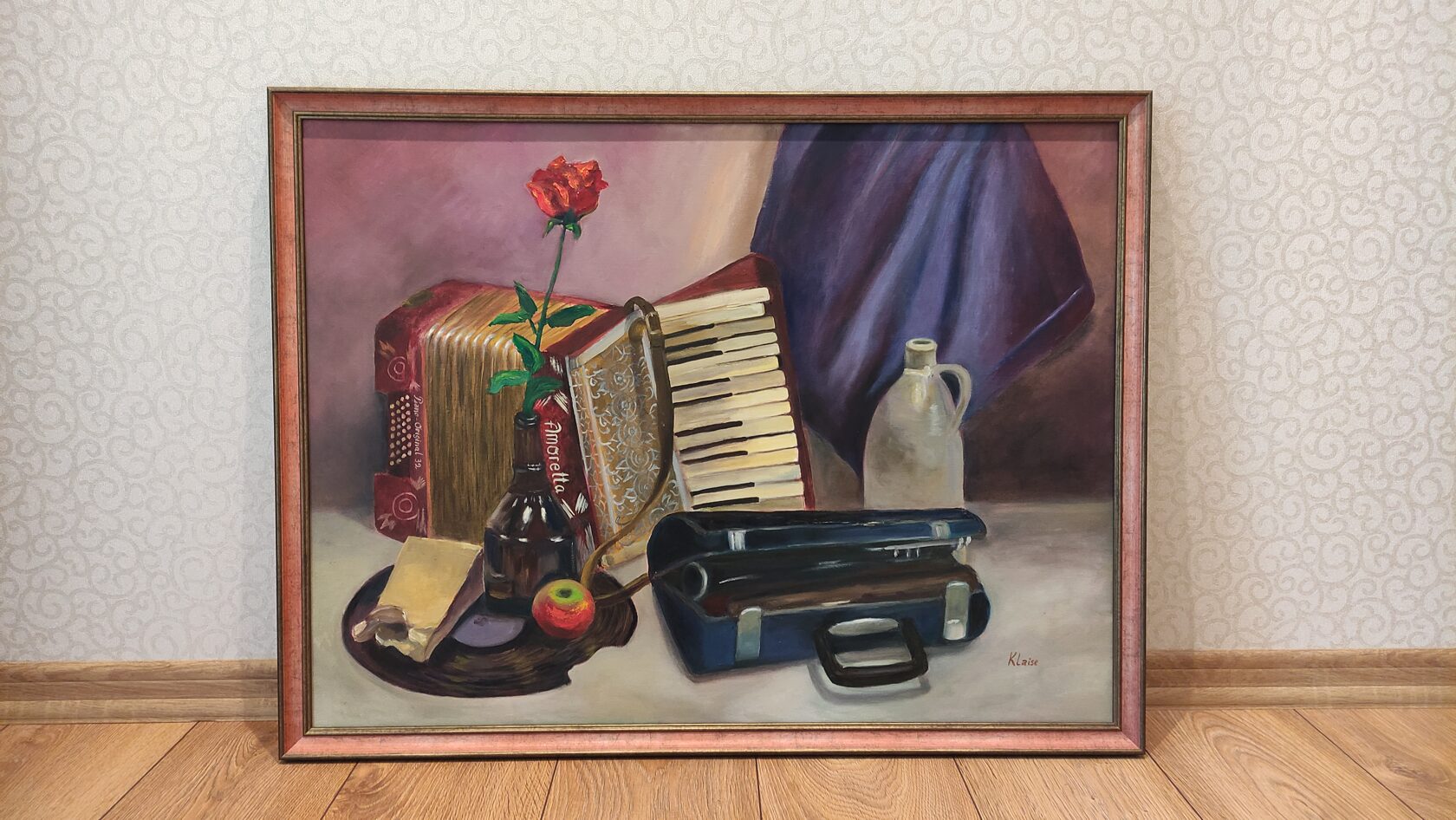 The central place in the composition is occupied by an old accordion, a symbol of folk music and nostalgia. Next to it is a beige ceramic vase, adding an element of elegance and domestic comfort to the composition.