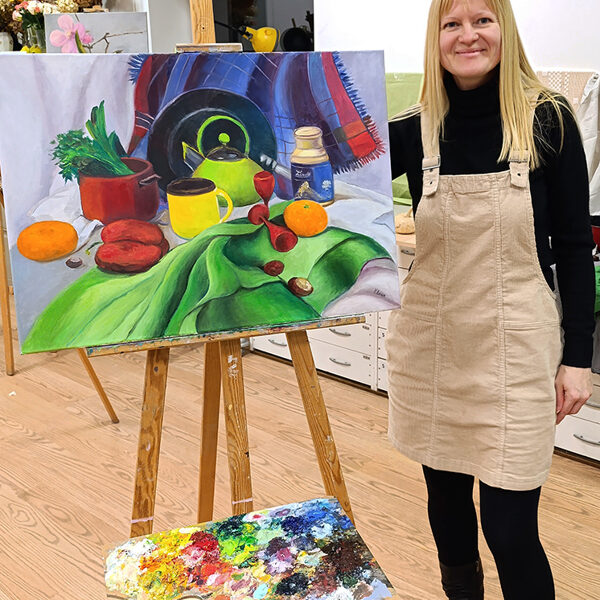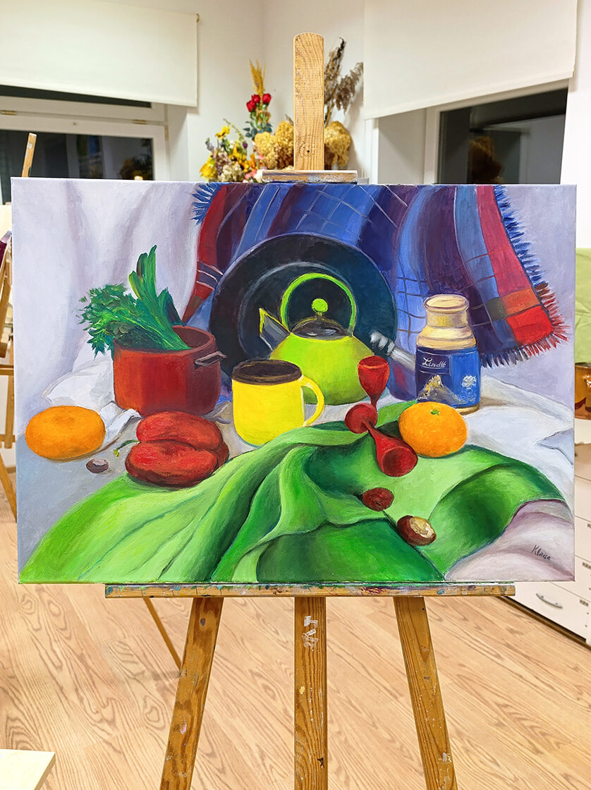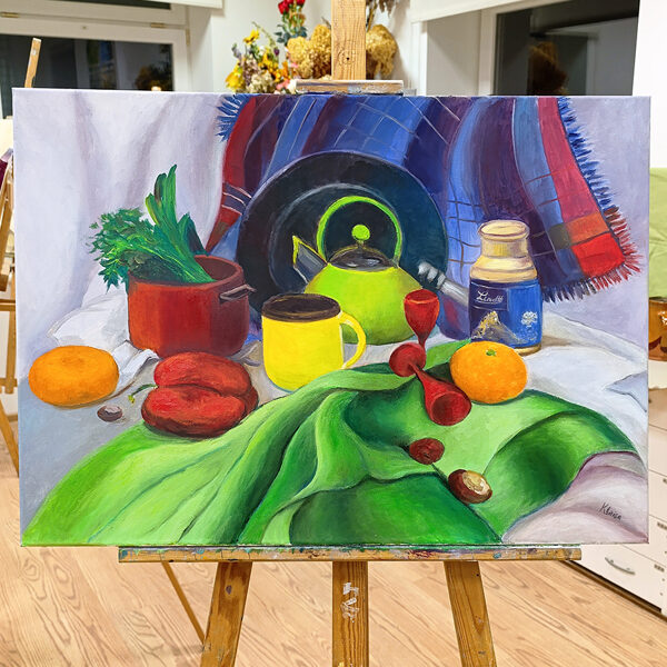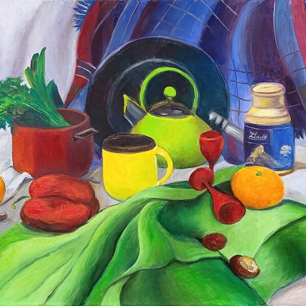 "Vivid Vernacular" is a striking oil painting that transforms a collection of everyday household objects into a celebratory explosion of color and texture. At the heart of the composition sits a radiant, lime-green teapot, its bold hue echoed by a fluid green drapery that cascades toward the viewer, grounding the scene with a sense of movement.