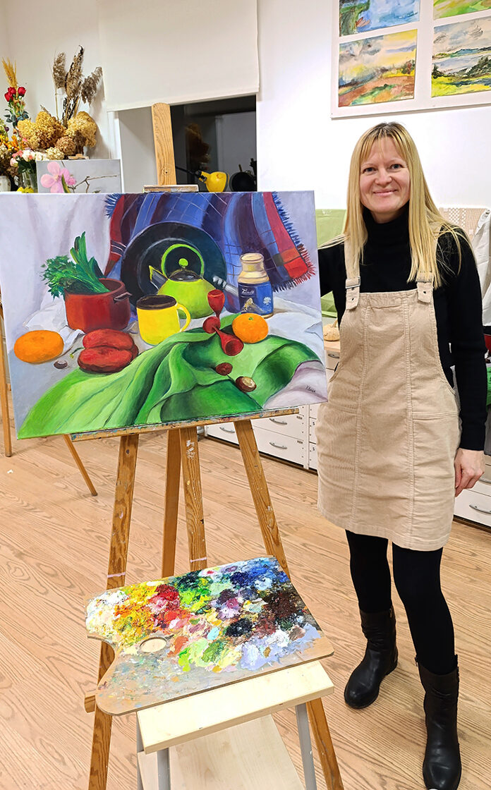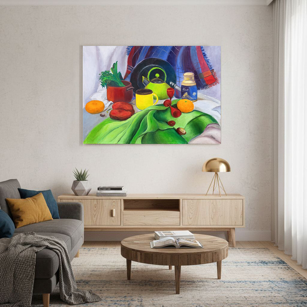 Still Life on Canvas, Vivid Kitchen Art, Green Teapot Art, Impressionist Decor, Colorful Wall Decor, Modern Realism Art, Domestic Vernacular, Fruit Still Life Oil, Housewarming Gift, Bright Tabletop Scene, Large Canvas Artwork, Handmade Fine Art