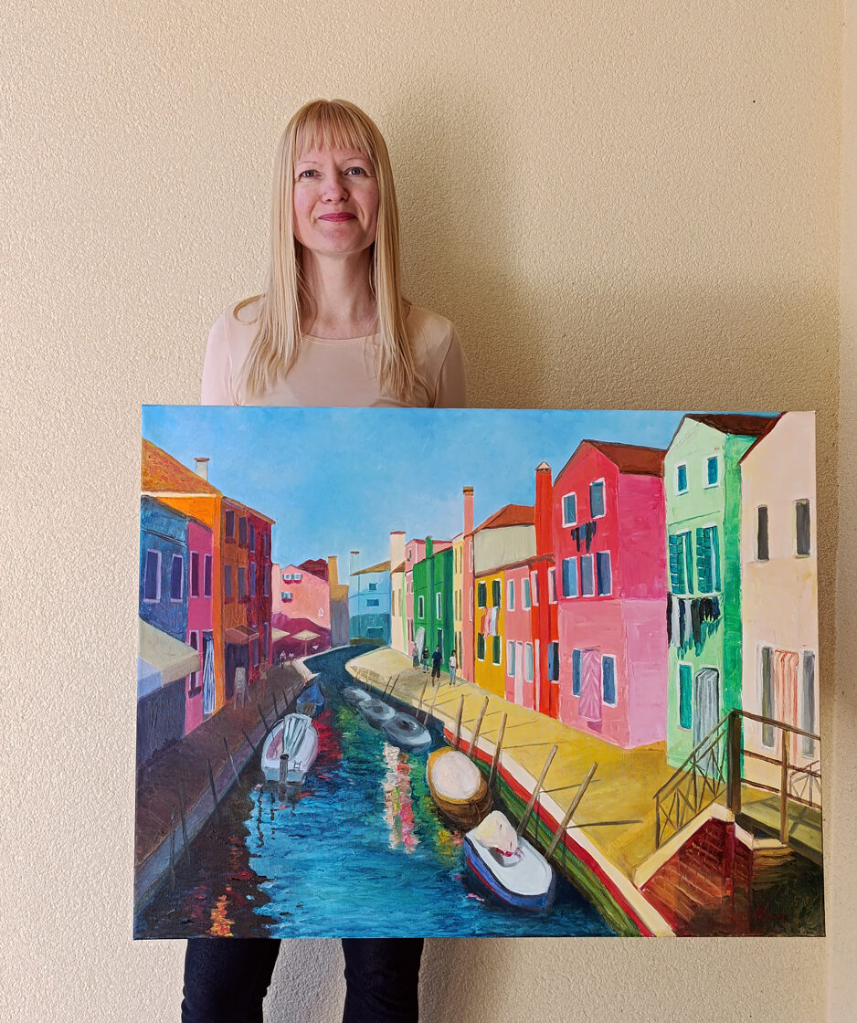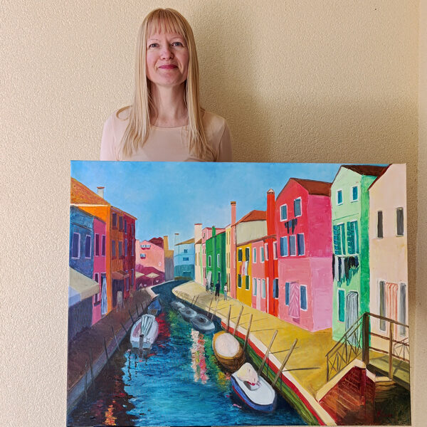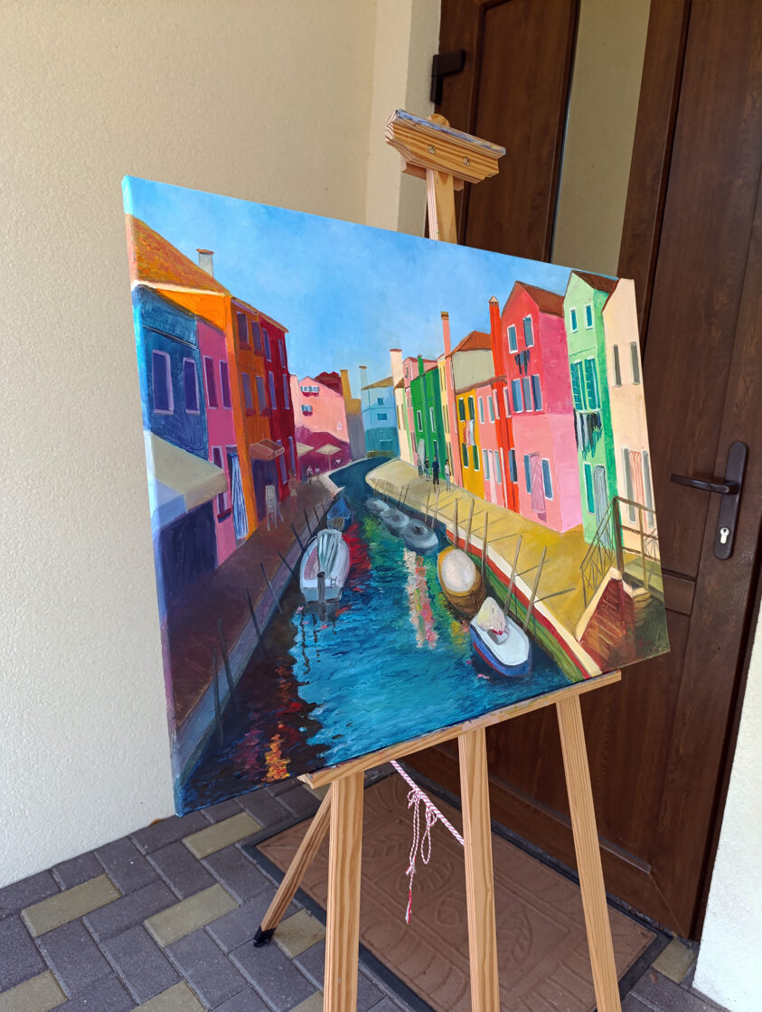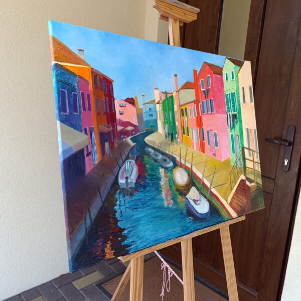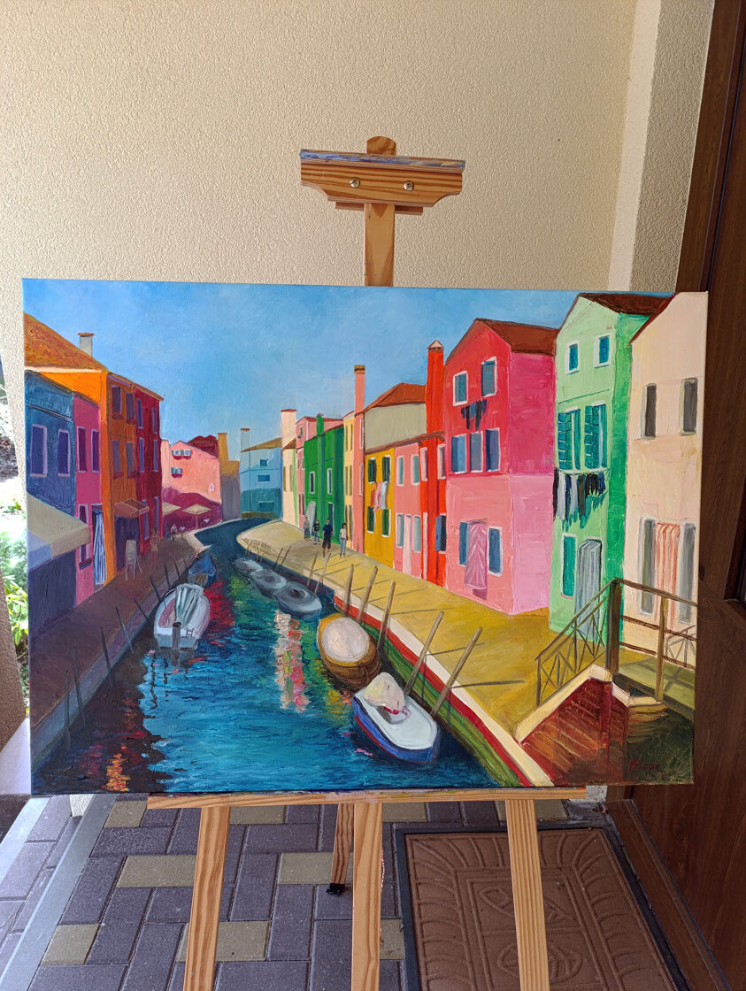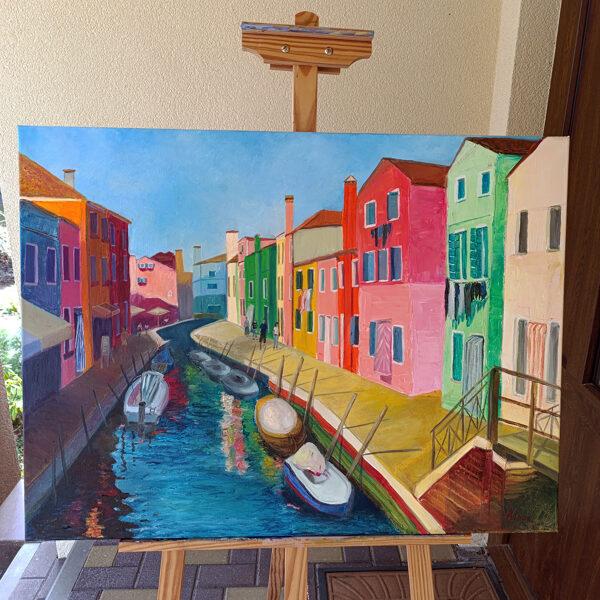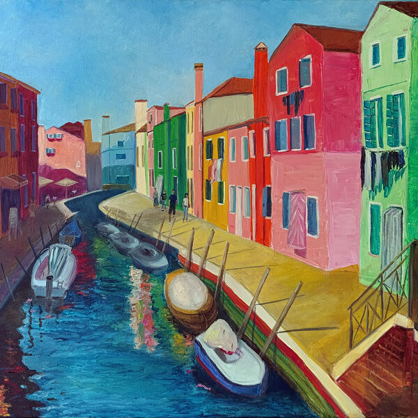 "Burano" is a piece born from my memories of visiting the delightful island of Burano in Venice. In this painting, I sought to recreate the joy and vibrancy I felt while walking along its canals, surrounded by a kaleidoscope of colorful homes. The scene showcases boats moored in the waterway, people leisurely passing by, and the bright sunshine casting shadows, all under a serene blue sky. It's an attempt to capture the unique charm and spirit of Burano.