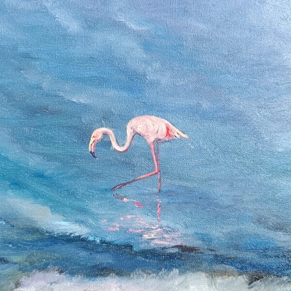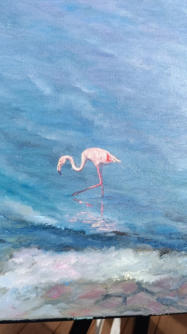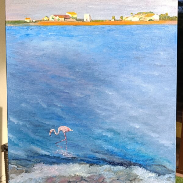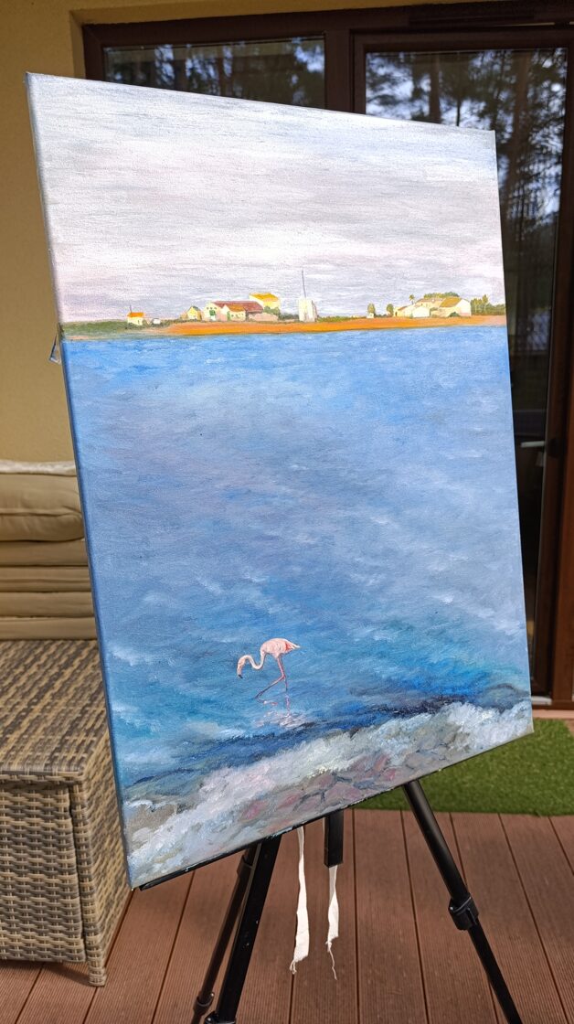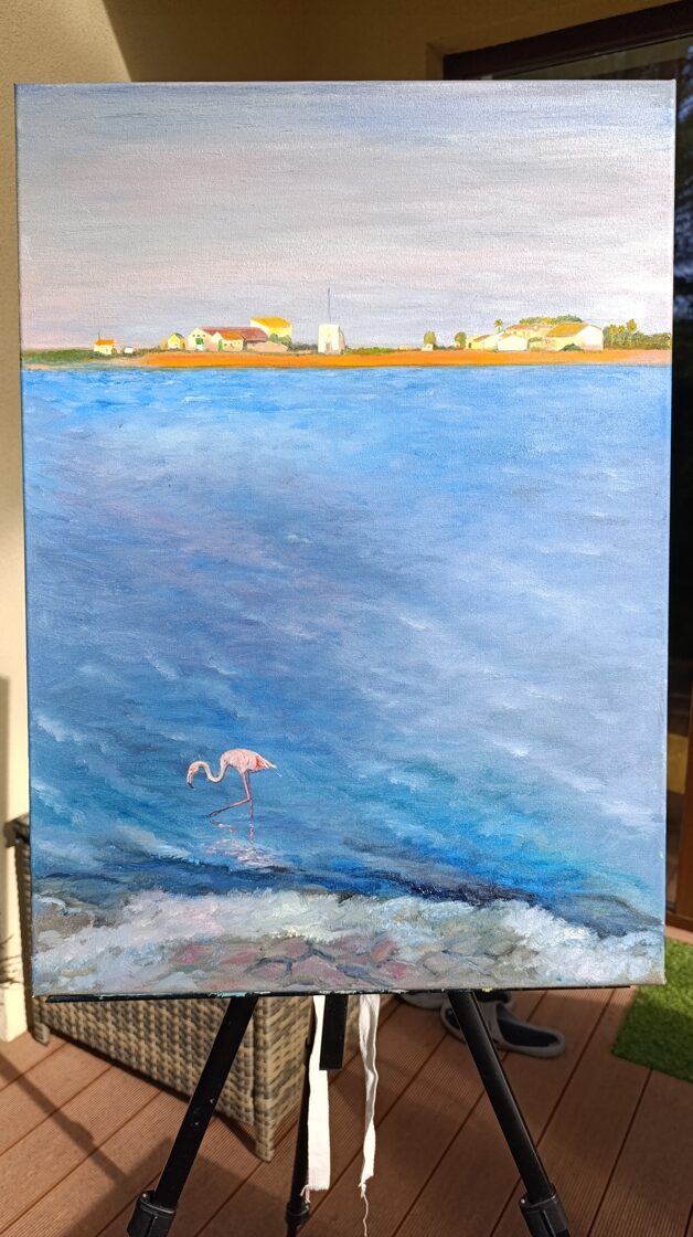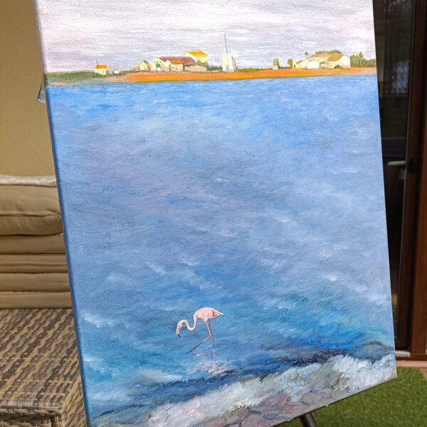 This painting is a moment frozen in time, capturing a fleeting memory from a journey between Torrevieja and Alicante. The artist masterfully conveys the liminal state between day and night, hustle and tranquility. The sky, painted in gentle shades of silver and a rosy haze, reflects the setting sun. A warm light still plays on the rooftops of houses, while below, in the salty expanse, a lonely flamingo wades—a symbol of peace amidst endless motion.